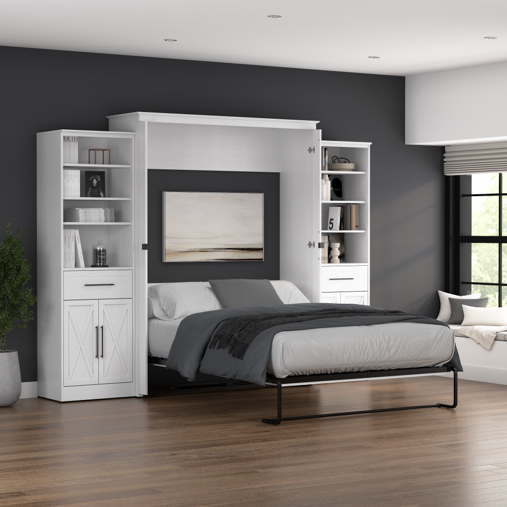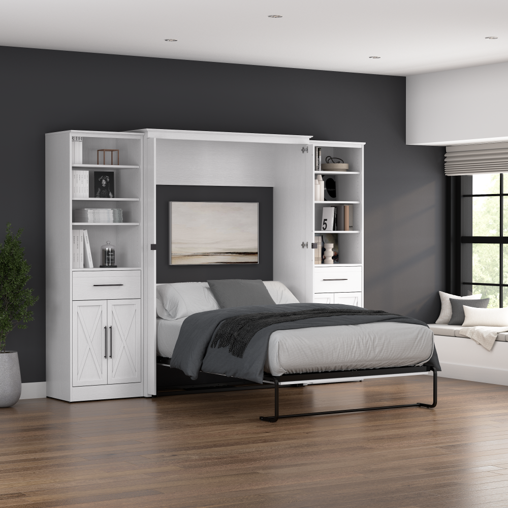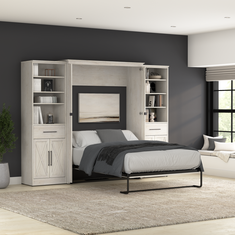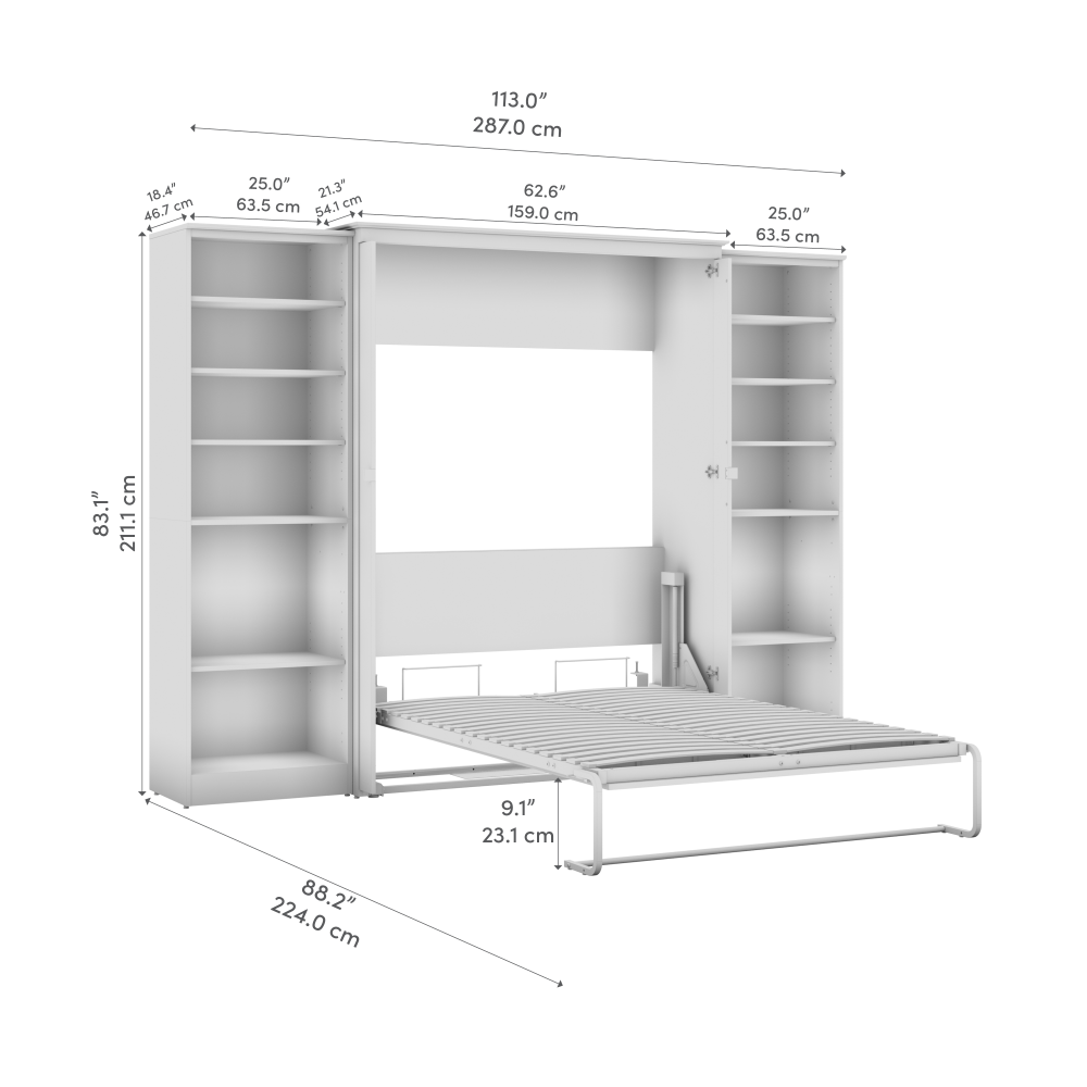 - Cadre du lit mural en acier durable et caisson en bois d’ingénierie laminé avec patins niveleurs ; la hauteur du mur d’ancrage doit être au minimum 92.1 po (233.9 cm) et le lit ouvert nécessite un dégagement de 92.9 po (236 cm) à partir du mur
