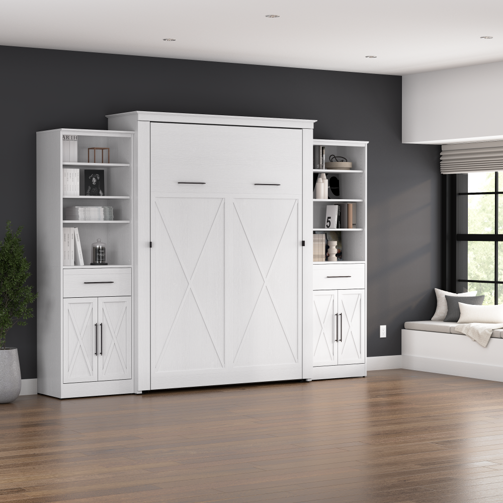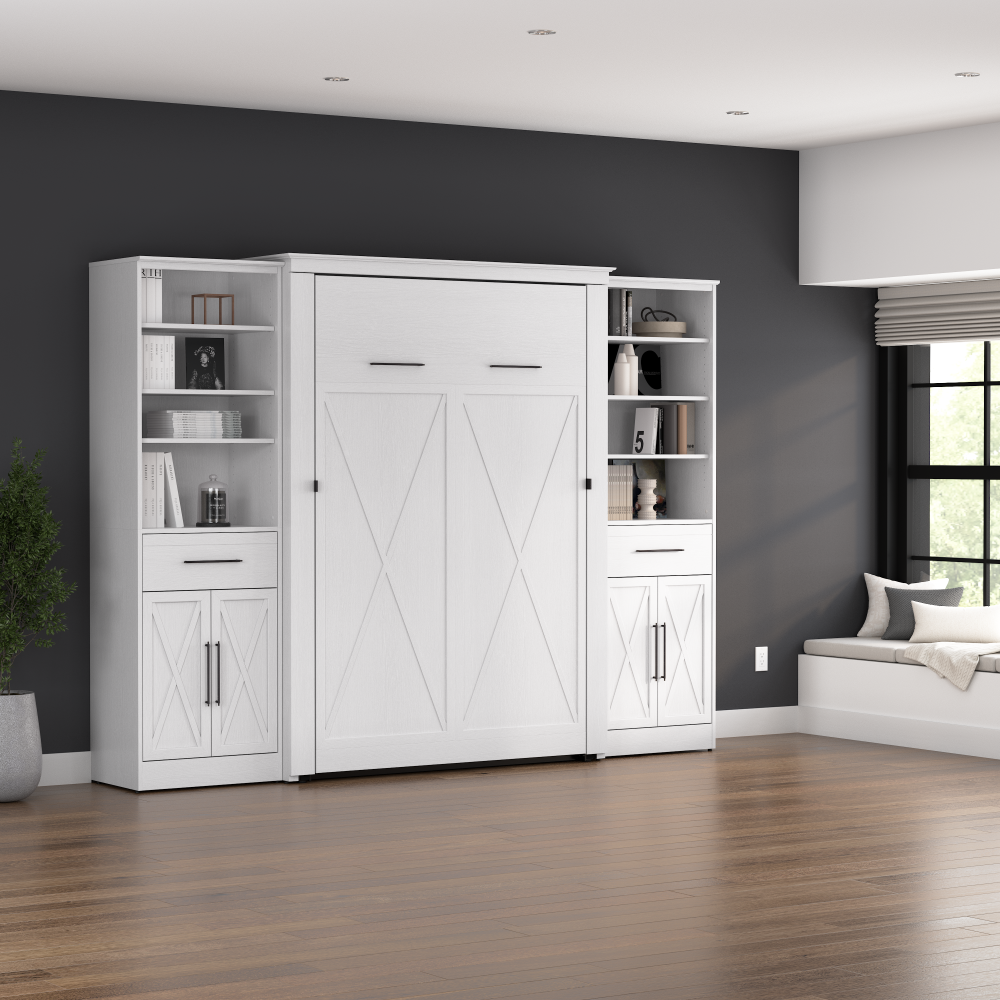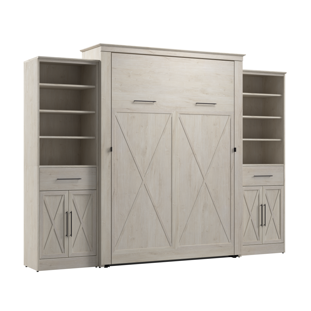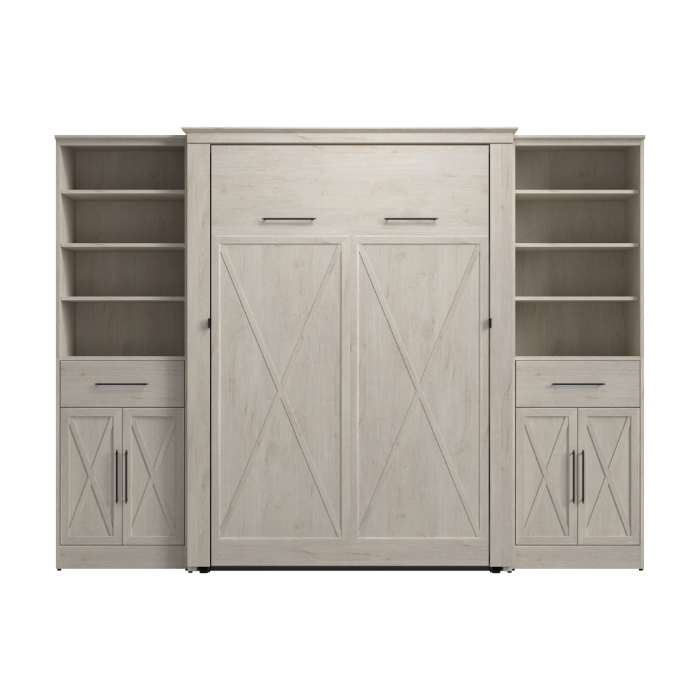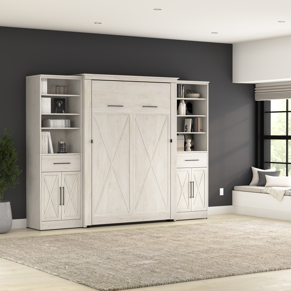 - Cadre du lit mural en acier durable et caisson en bois d’ingénierie laminé avec patins niveleurs ; la hauteur du mur d’ancrage doit être au minimum 92.1 po (233.9 cm) et le lit ouvert nécessite un dégagement de 92.9 po (236 cm) à partir du mur