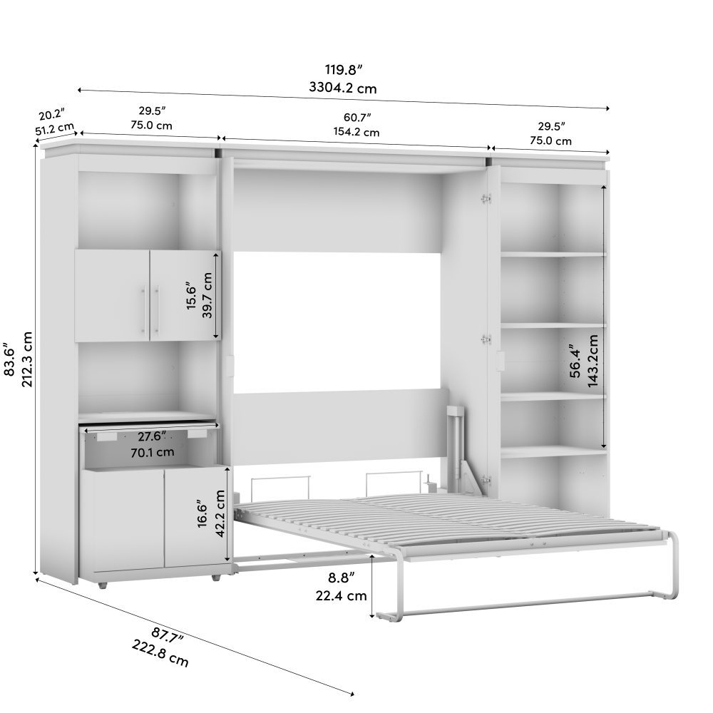 - Cadre du lit mural en acier durable et caisson en bois d’ingénierie laminé avec patins niveleurs ; la hauteur du mur d’ancrage doit être au minimum 84.3 po (214.2 cm)