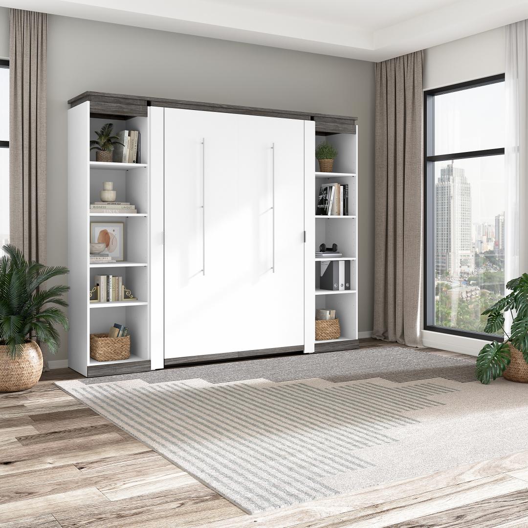 The Bestar Orion Full Murphy Bed with Shelves (100W) presents a space-saving bedroom solution with modern style and convenience. Whether you need to make the most of a small apartment or simply want a guest bedroom to host the occasional visitor, this full wall bed promises to make a great addition to your home. A dual piston system allows you to fold the full-size Murphy bed down quickly and smoothly so you can sleep comfortably at night while enjoying your space during the day. The cabinet bed accommodates most full-size mattresses and is designed to be used without a box spring. Take advantage of two fixed and three adjustable shelves on each side to organize a collection of books, brighten up the room with decorations, and keep bedside essentials within reach. Each shelf supports up to 30 pounds, so you can store and display larger items with confidence. To avoid risk of injury, the bed must be installed to the wall and floor structure by a professional or qualified person. Two people are required for assembly. Installation requires attachment to wood studs or masonry, removal of the baseboard, and drilling into the floor. Necessary hardware is included. Do not use this product for children or pets under 50 pounds (22.7 kg). The minimum ceiling height is 84.3 inches and the open pull-down bed extends 87.7 inches from the wall. This full Murphy bed with storage is North American made with globally sourced materials and is backed by a 5 Year Warranty.