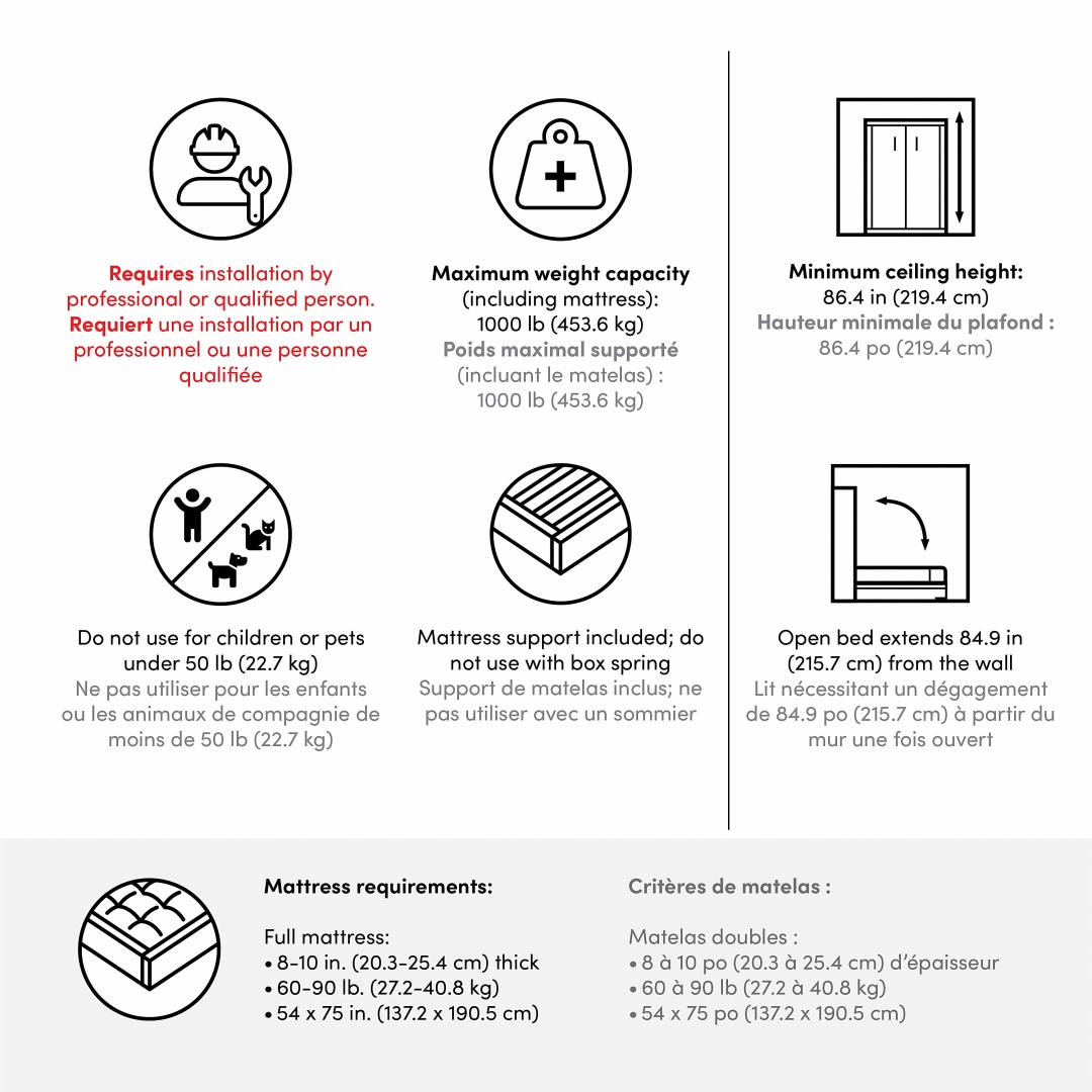• Full size Murphy bed accommodates most standard full mattresses (8-10 inches thick, 60-90 lb, 54 x 75 inches, no futons) to let you choose the most comfortable option (mattress not included, do not use with box spring)