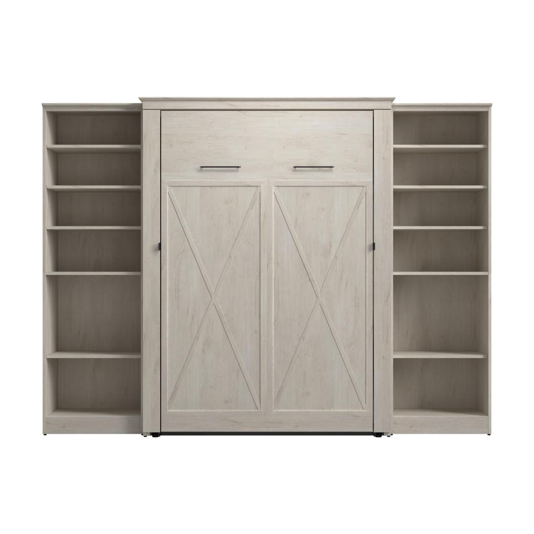 The Bestar Key West Full Murphy Bed with Closet Organizers (113W) is the ideal space saver for a multipurpose room. Unique X pattern accents paired with Antique Bronze hardware create a relaxed and airy style that works well with coastal and farmhouse decor. The Full Murphy bed folds up and down smoothly and quickly thanks to the dual piston system. Choose your own mattress since the bed accommodates most standard Full mattresses (8-10 inches thick, 60-90 lb, 54 x 75 inches) and supports up to 1000 lb (including mattress). The open bed extends 88.2 inches from the wall. Allow a clearance of 30-36 inches around the open bed. The dual-mount wall bed mechanism attaches to the floor and wall for ease of assembly and maximum stability and durability. Take advantage of the tall cabinets’ fixed and adjustable shelves to organize items of various sizes. To avoid risk of injury, the Murphy bed must be installed to wall and floor structure by a professional or qualified person. Two people are required for assembly. Installation requires attachment to wood studs or masonry, removal of the baseboard, and drilling into the floor (if disassembly is required, holes may be covered with baseboards 0.5 inches or thicker). All necessary hardware is included. The cabinet must be anchored to a wall with a minimum ceiling height of 87 inches. Do not use this product for children or pets under 50 pounds (22.7 kg). The Murphy Bed is backed by the Bestar 10 Year Manufacturer’s Warranty.