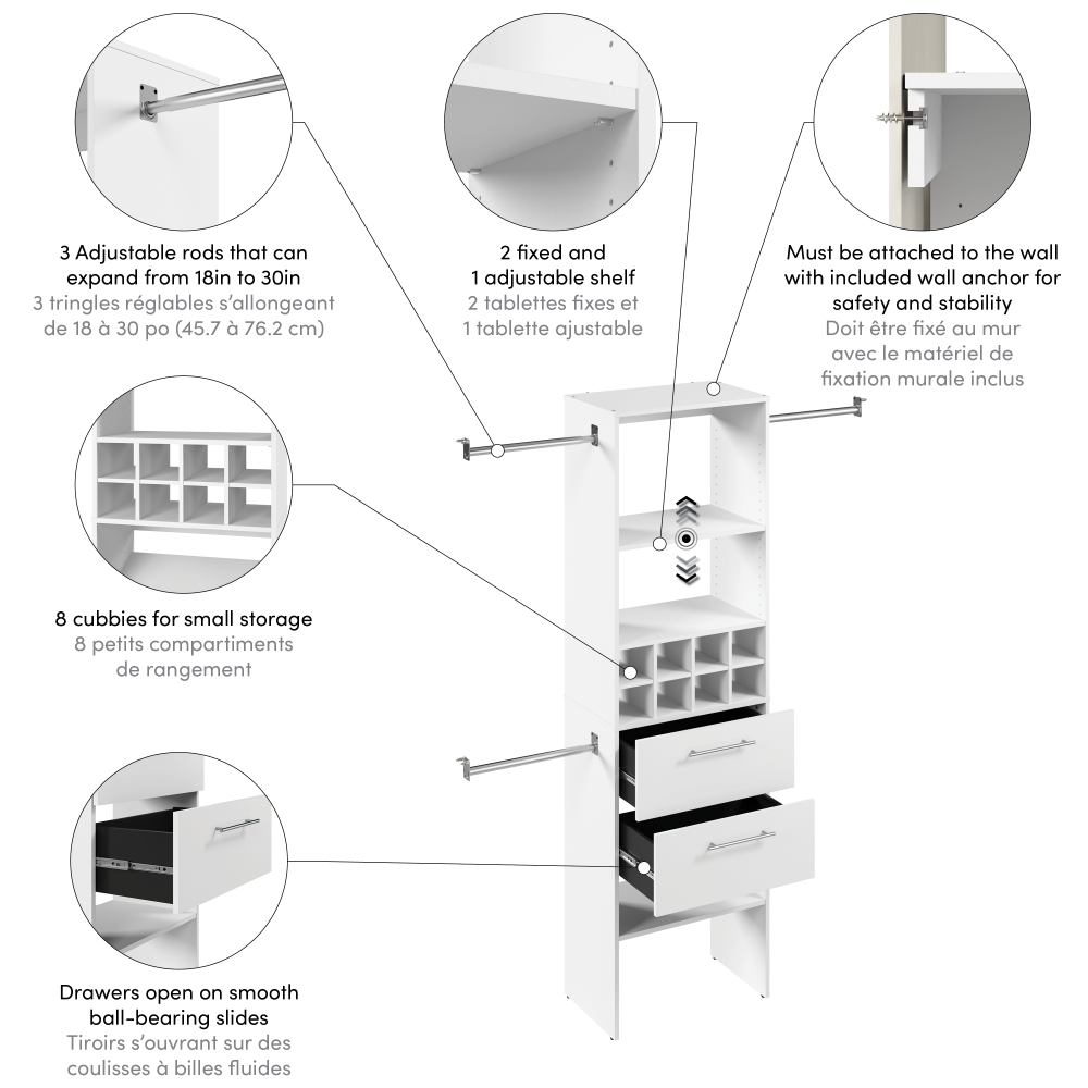 <p>The Bestar Carina Closet Kit with Shoe Shelves, Clothing Rods & Cubbies, 24W x 15D is the perfect storage solution for any space, style, and budget. The Closet Starter Kit includes 3 adjustable clothing rods, 8 cubbies, 5 interior shelves (3 shoe shelves) to customize your closet organization.<p/><br><p>This versatile home organization system allows to effortlessly store shirts, pants, jackets, sweaters, shoes, decor, and other personal items. The closet organizer with shelves and rods fits closets 5 to 7 feet wide and must be attached to the wall with included wall anchor for safety and stability. The adjustable rods can be fixed on the sides of your closet cabinet and they expand from 18 to 30 in., creating up to 90 in. of hanging space; each rod supports up to 50 lbs.<p/><br><p>The 3 bottom angled shelves with front lips prevent shoes, bags, or clothes from sliding off; 2 top slanted shelves can be lowered ar raised to display different types of shoes, including heels, sneakers, boots, and more. These shelves are perfect for storing more shoes in a vertical and more visible space. Top surface is ideal to store blankets, bags, or personal items you don’t reach for often.<p/><br><p>The modern and multipurpose design beautifully fits your closet, entryway, bedroom, kids closet, or hallway. Quality engineered wood compliant with TSCA Title VI. Assembly required (2 people recommended). Backed by the Bestar 5 Year Manufacturer’s Warranty. North American made with globally sourced materials.</p>