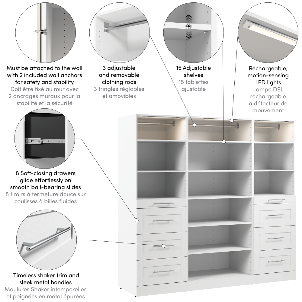 Modular Closet System with Shelves, Drawers, Clothing Rods & LED Lights, Slab Style, 85W x 25D | 127617-000017