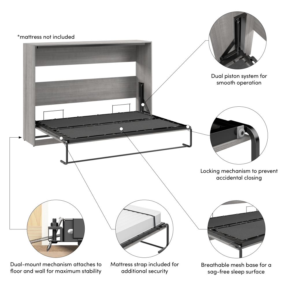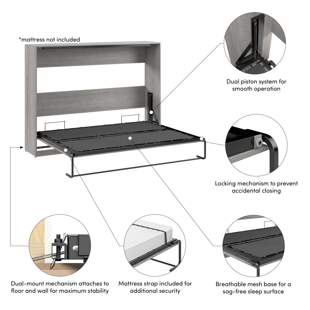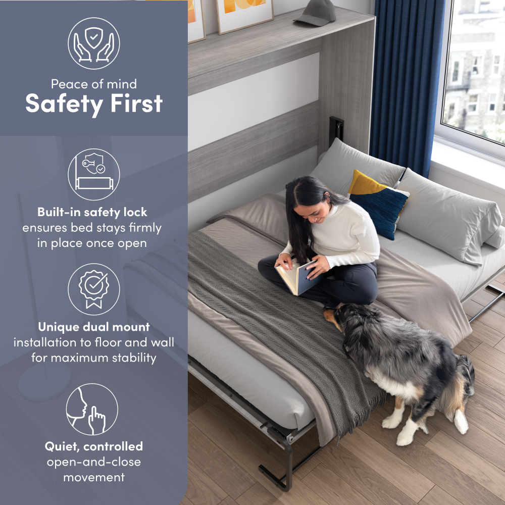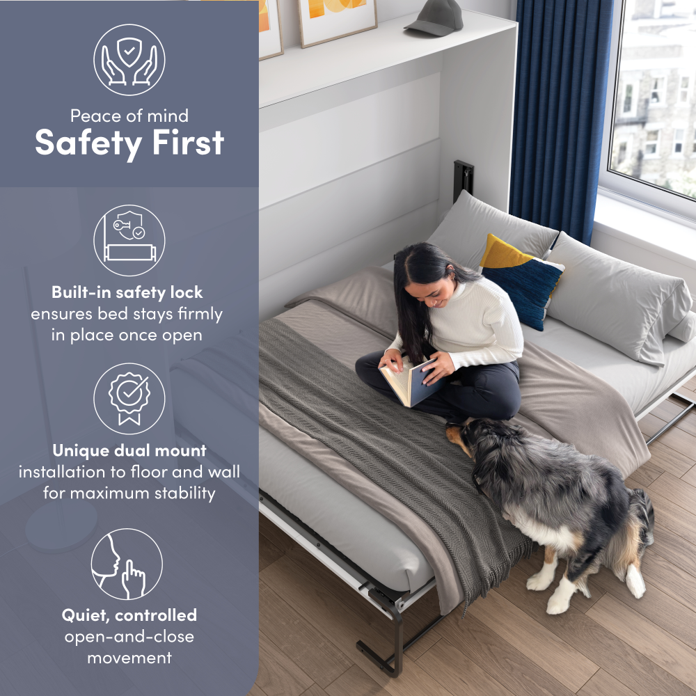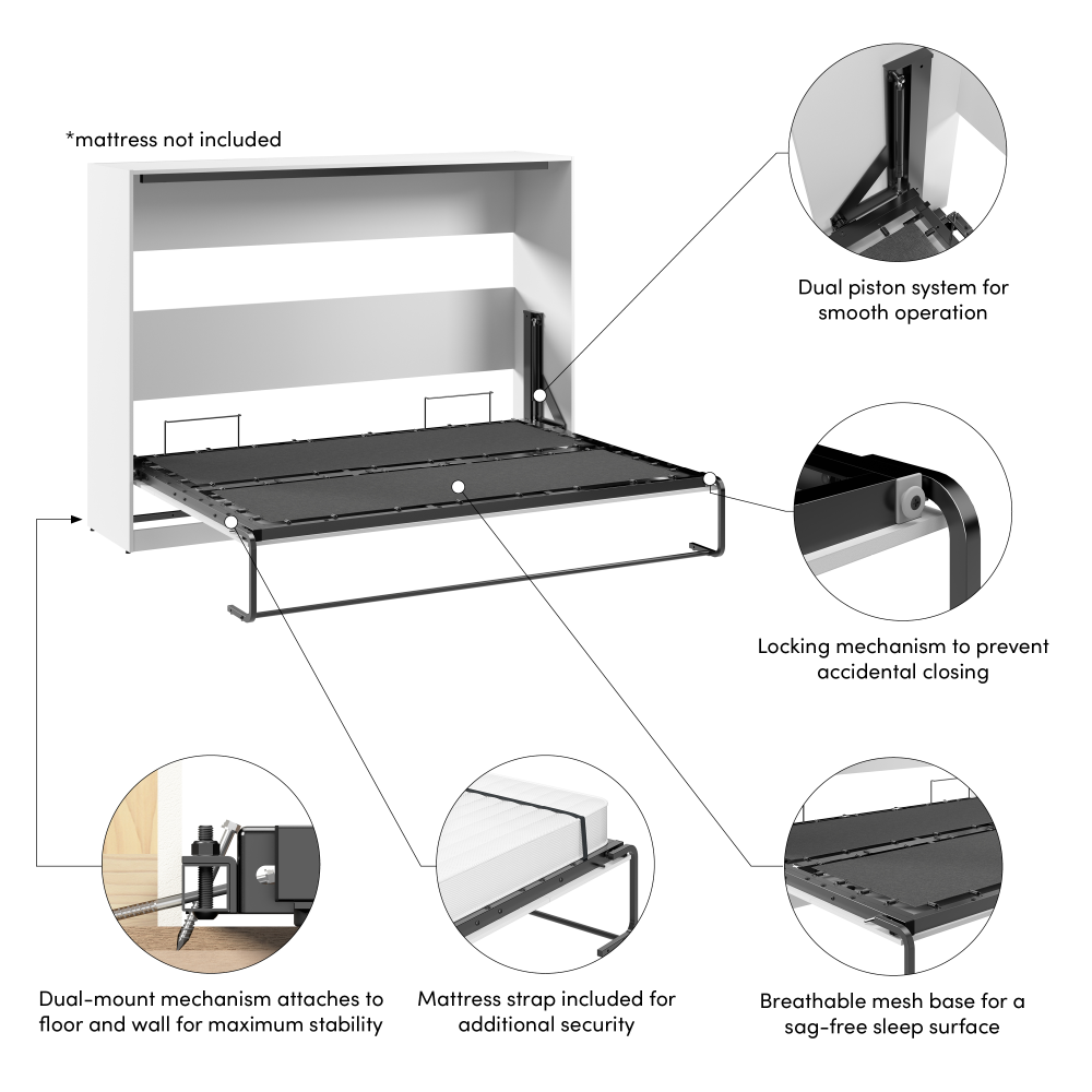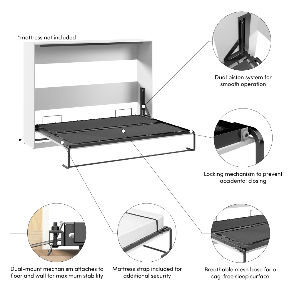 - Stable Mechanism: The dual-mount system secures the bed to both the wall and floor for maximum stability, while a locking mechanism prevents accidental closing while in use