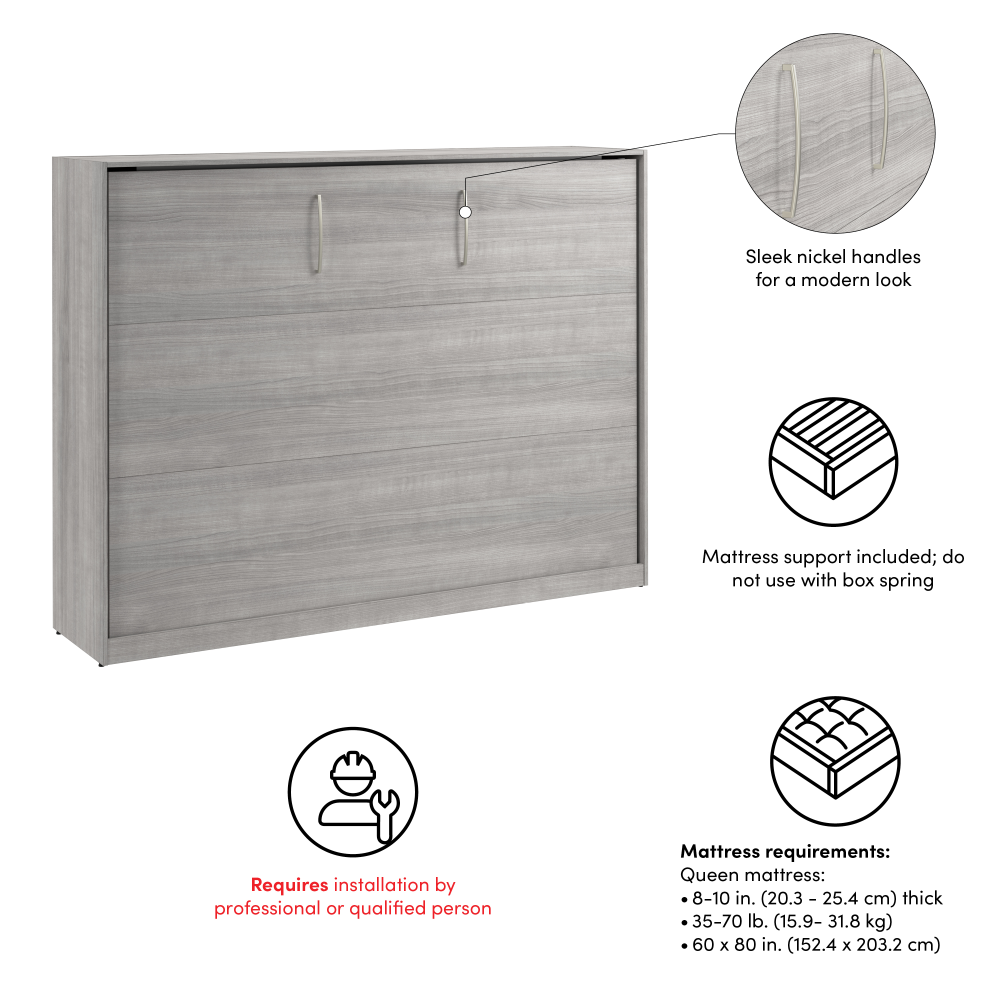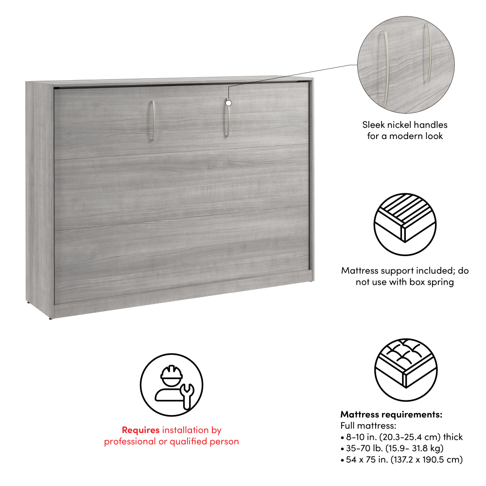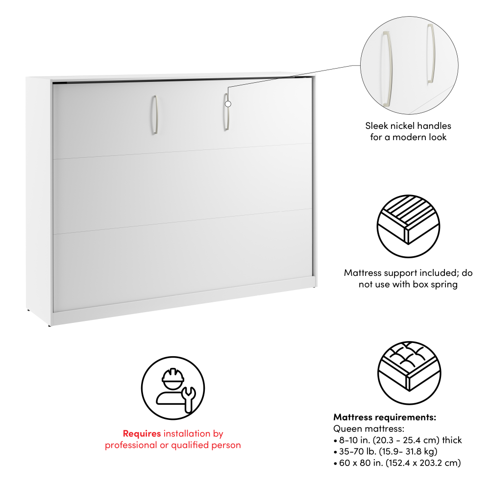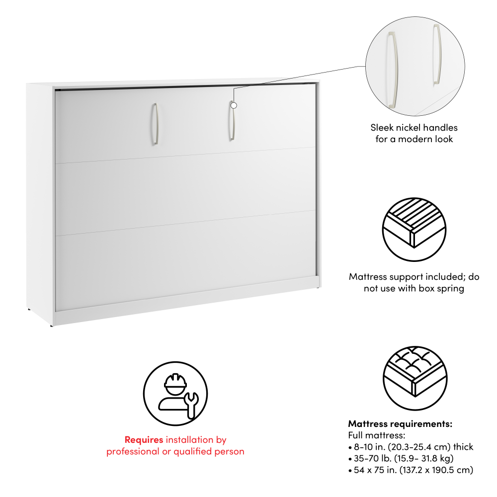 For Bestar Horizontal Murphy Beds, we recommend using a standard full or queen mattress (depending on your bed size) that is a weight of 35-70 lbs and 8–10 inches thick. This thickness ensures the bed closes properly while still providing excellent comfort. Memory foam or high-quality hybrid mattresses are popular choices, as they offer great support without being too heavy for the lifting mechanism. Avoid extra-thick or pillow-top mattresses, as they may prevent the bed from folding completely. -
