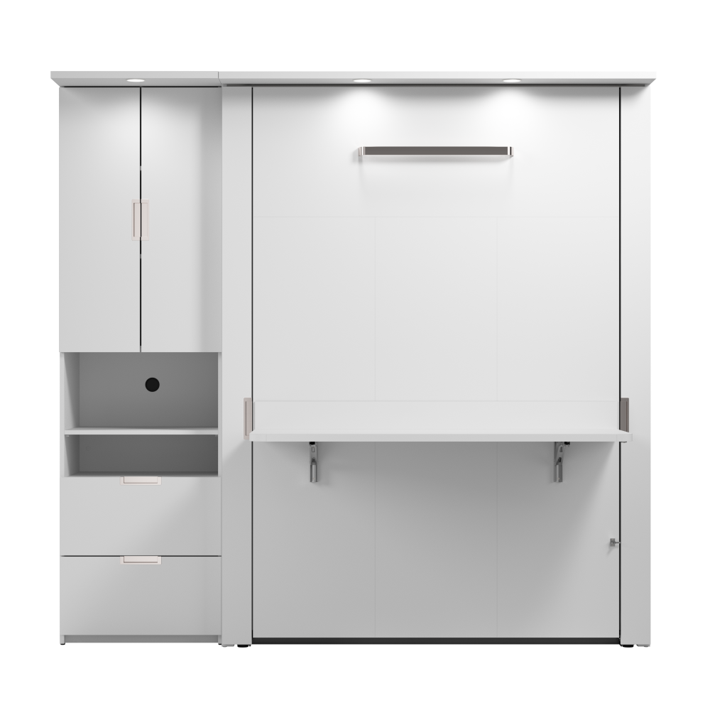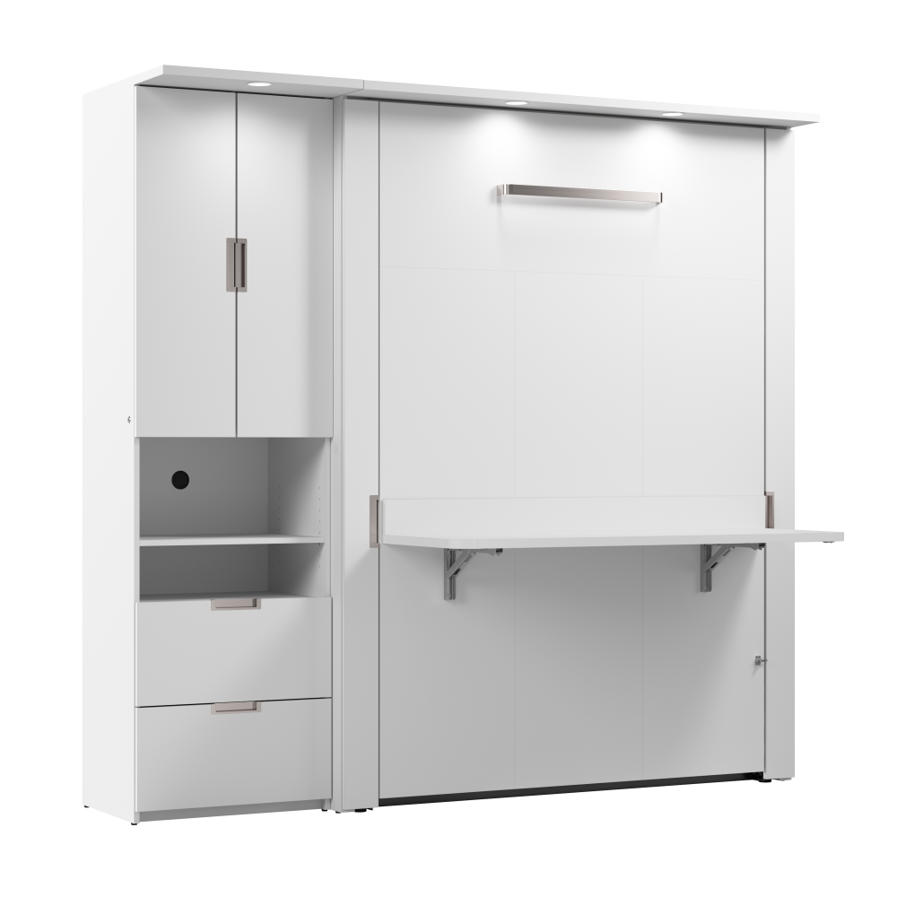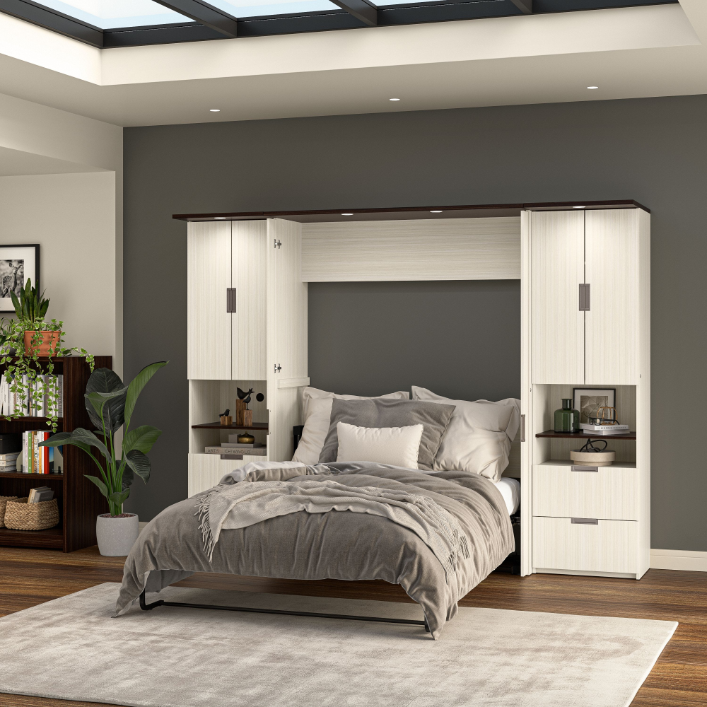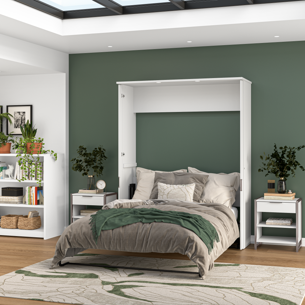 Bestar Murphy Beds are designed to be compatible with most standard innerspring or memory foam mattresses that are 8-12 inches thick, weighing 60-90 lbs, and measuring 60x80 inches (Queen size). For Full size Murphy Beds, mattresses are typically 8-10 inches thick, 60-90lbs and 54 x 75 inches. This ensures proper operation of the bed mechanism and optimal comfort. Please note that the mattress must not contain a box spring, as this will not fit properly in the cabinet. -
