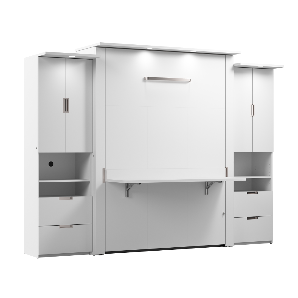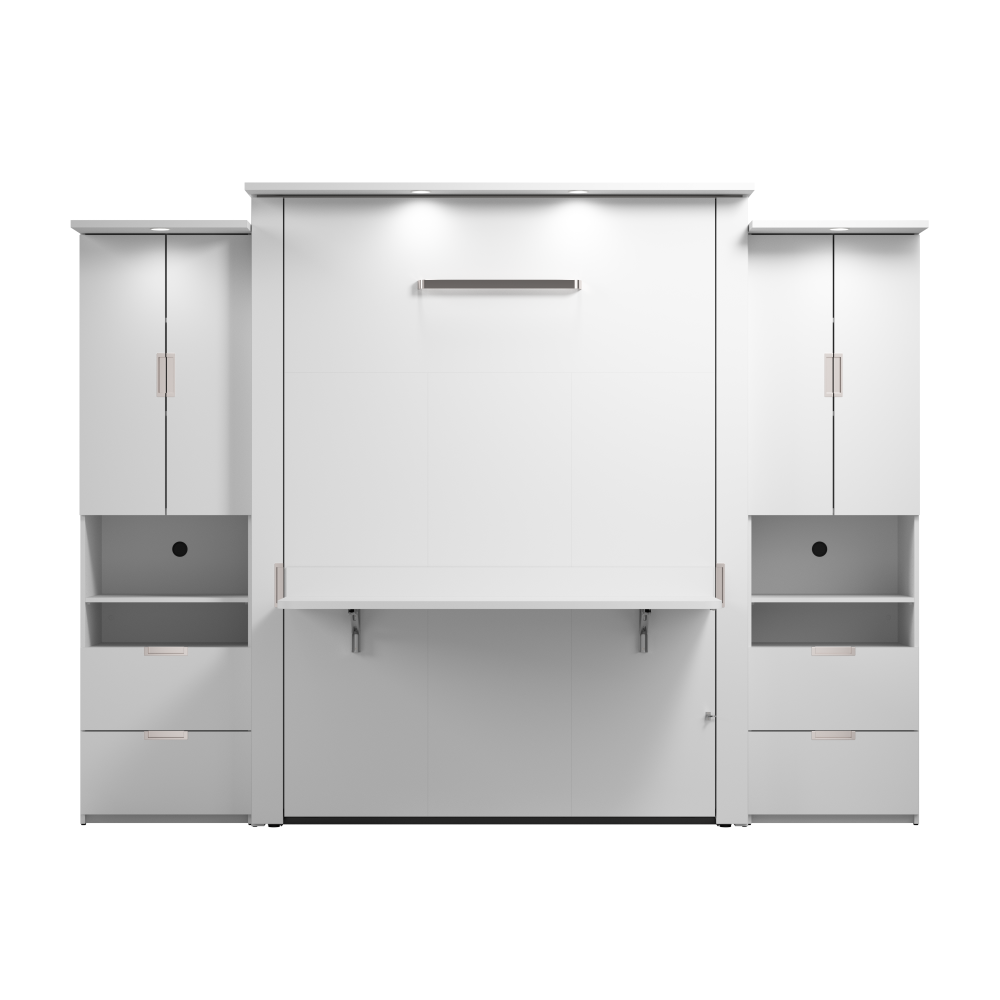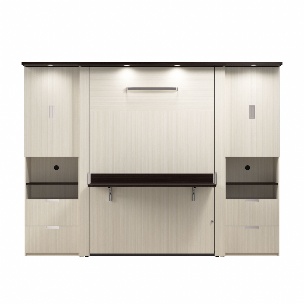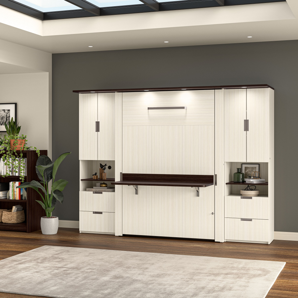 Bestar Murphy Beds are designed to be compatible with most standard innerspring or memory foam mattresses that are 8-12 inches thick, weighing 60-90 lbs, and measuring 60x80 inches (Queen size). For Full size Murphy Beds, mattresses are typically 8-10 inches thick, 60-90lbs and 54 x 75 inches. This ensures proper operation of the bed mechanism and optimal comfort. Please note that the mattress must not contain a box spring, as this will not fit properly in the cabinet. -