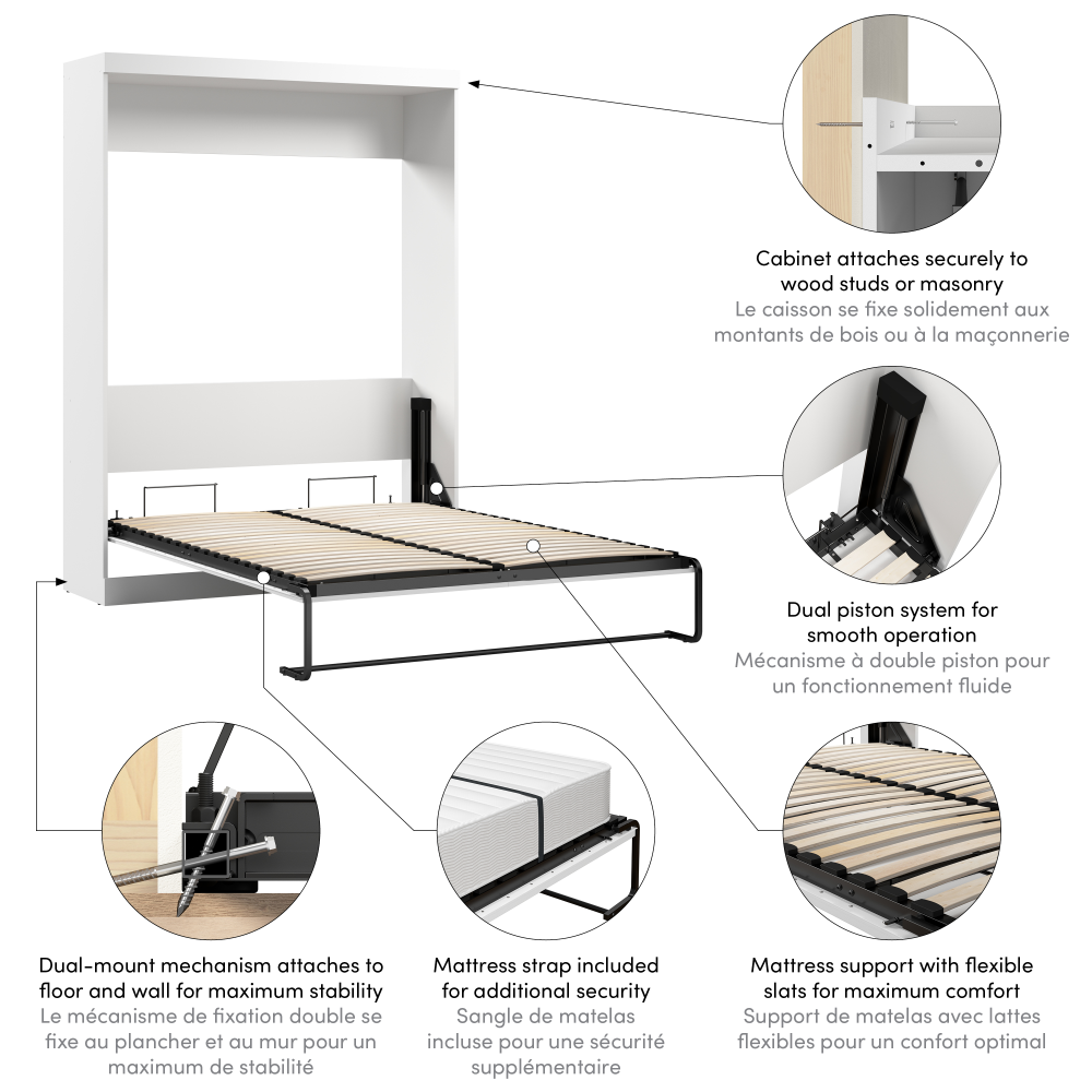 - Dual-mount wall bed mechanism attaches to floor and wall for ease of assembly and maximum stability and durability