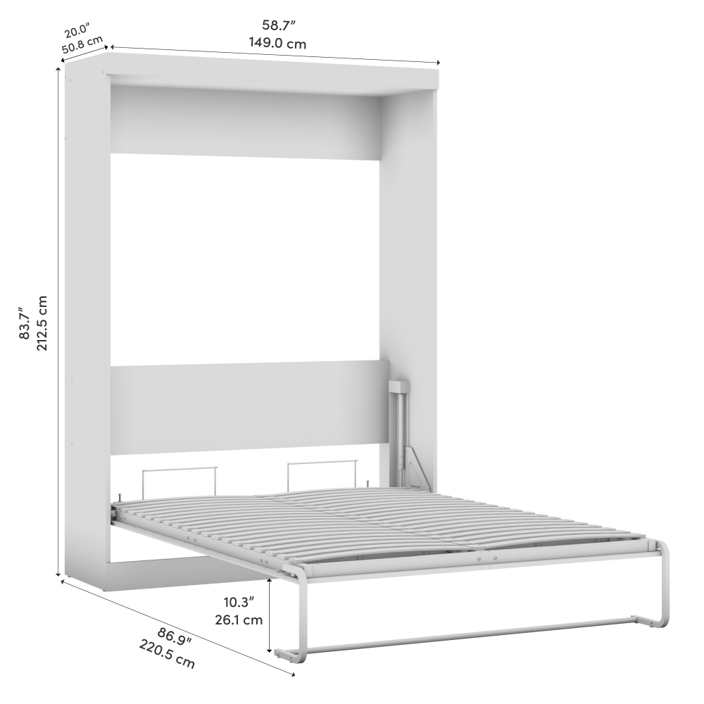 - Durable steel wall bed frame and laminated engineered wood cabinet with leg levelers; minimum ceiling height of anchoring wall is 85.8 inches
