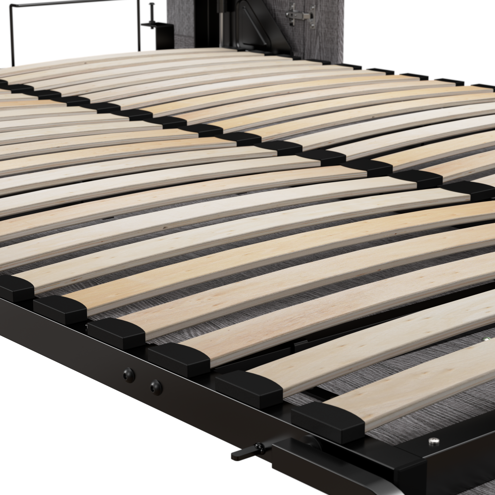 - Dual piston system folds the space saving bed up and down smoothly; mattress support uses flexible slats that absorb pressure for maximum comfort