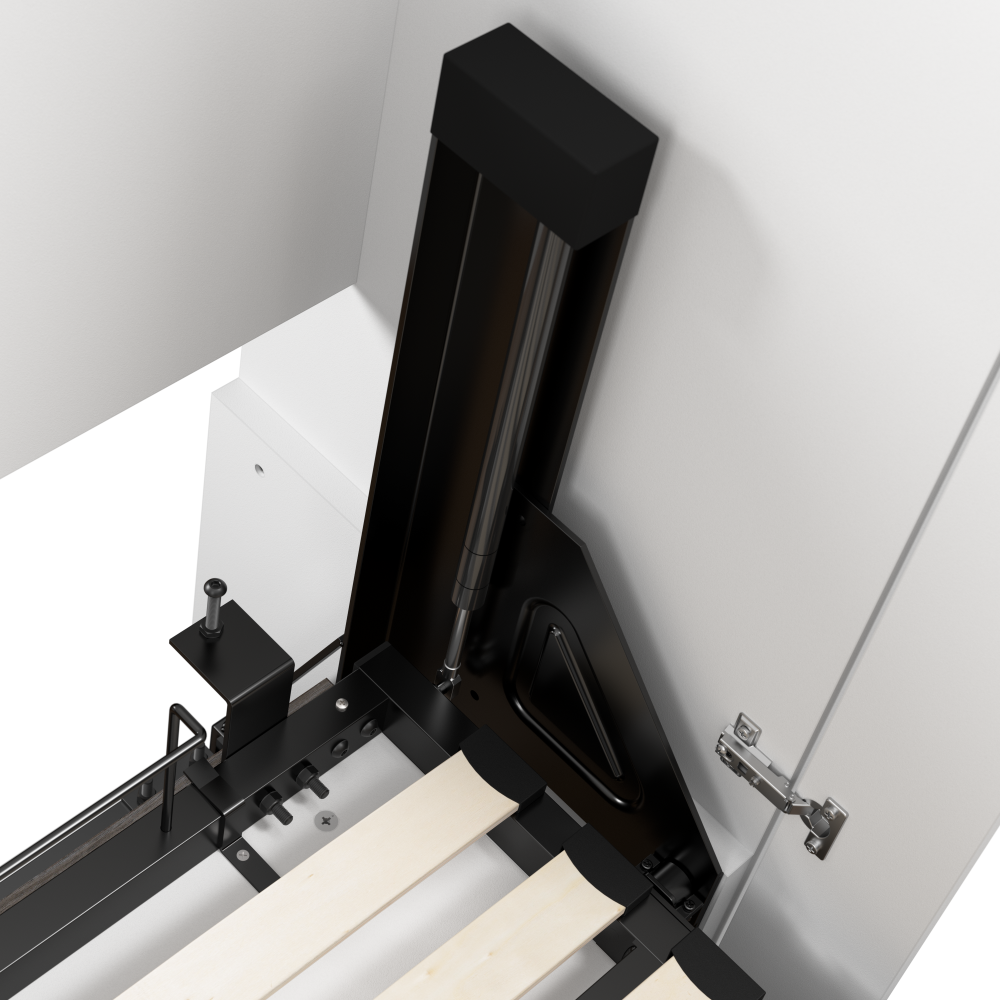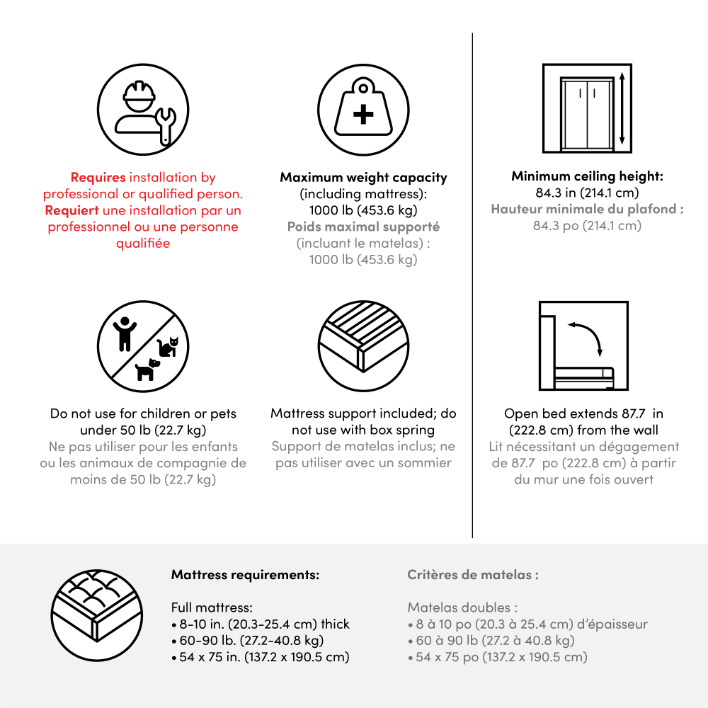 - Dual-mount wall bed mechanism attaches to floor and wall for ease of assembly and maximum stability and durability