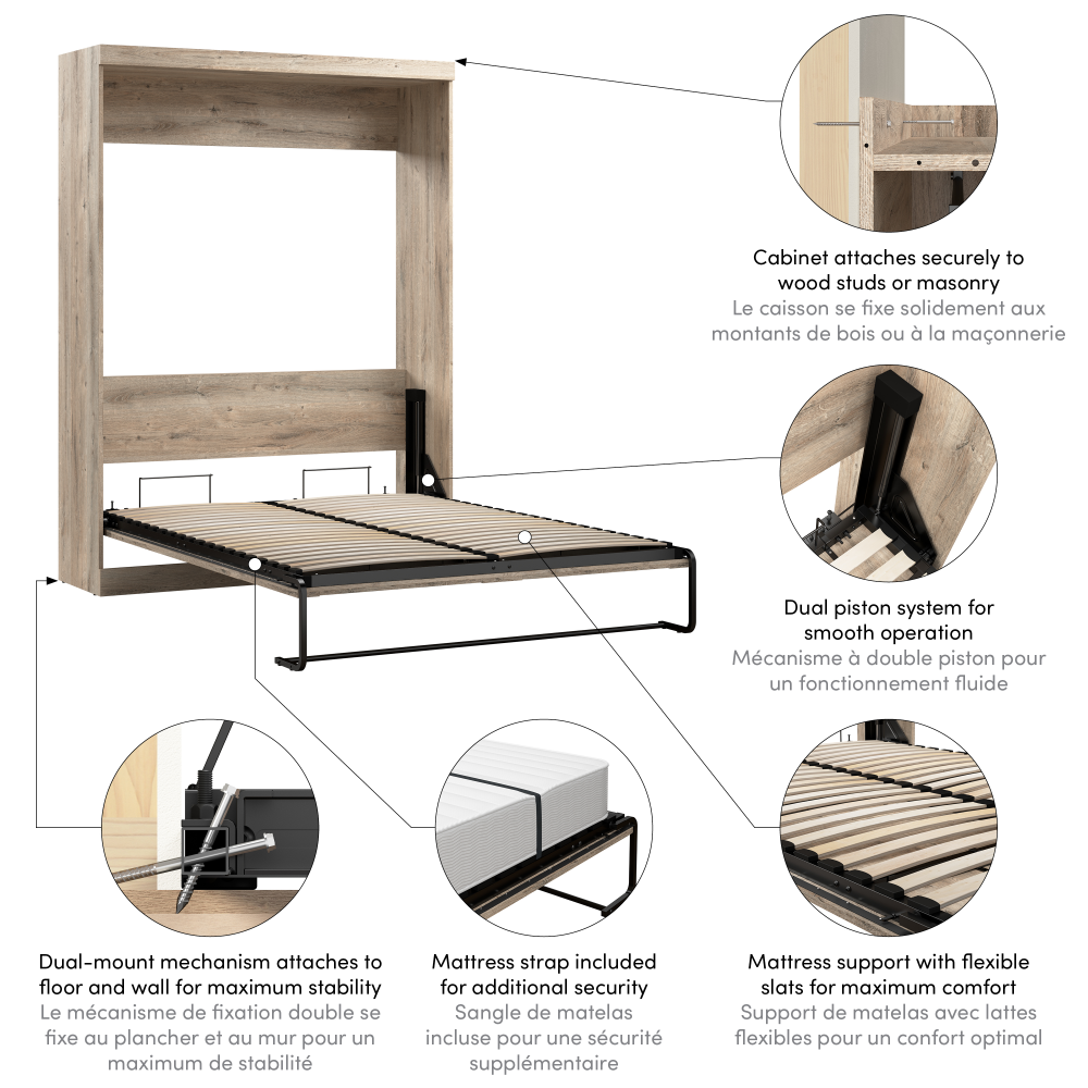 - Dual-mount wall bed mechanism attaches to floor and wall for ease of assembly and maximum stability and durability
